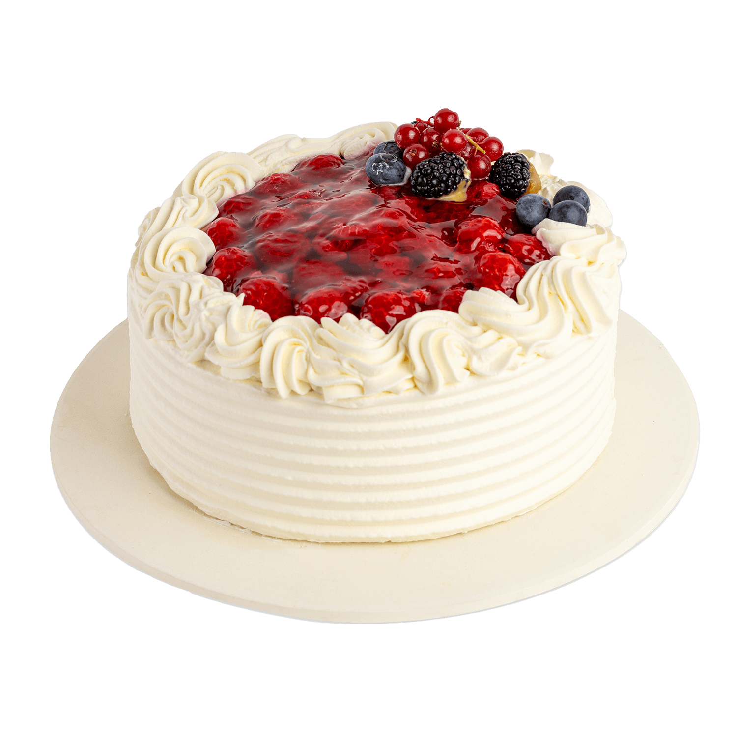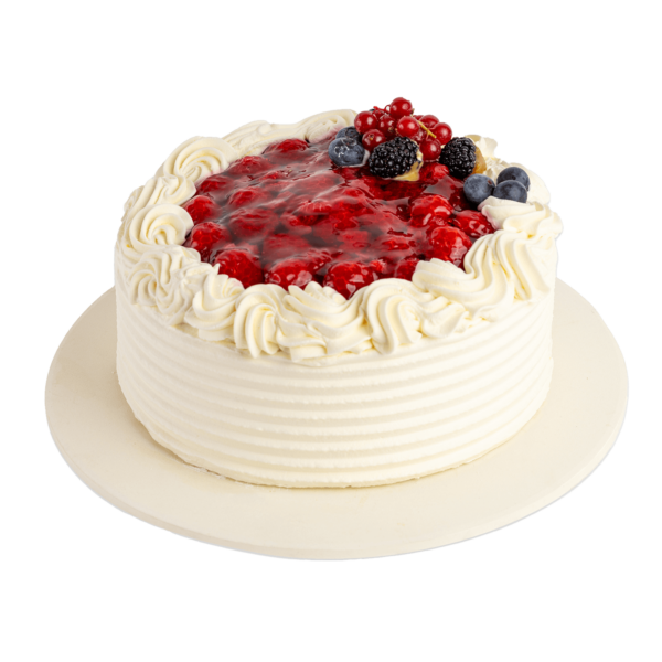 Vaalea pohja, Täyte: kermavaahto, vadelmamousse, vaniljakreemijauhe, Kostutus: sokerivesi, Päälle: vadelmat, Bakels-sile, Koristeluun: kerma, mantelikrokanttireuna
